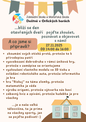 Ředitelka Základní školy a Mateřské školy Deštné v Orlických horách rozhodla o přijetí dětí k předškolnímu vzdělávání od školního roku 2025/2026.