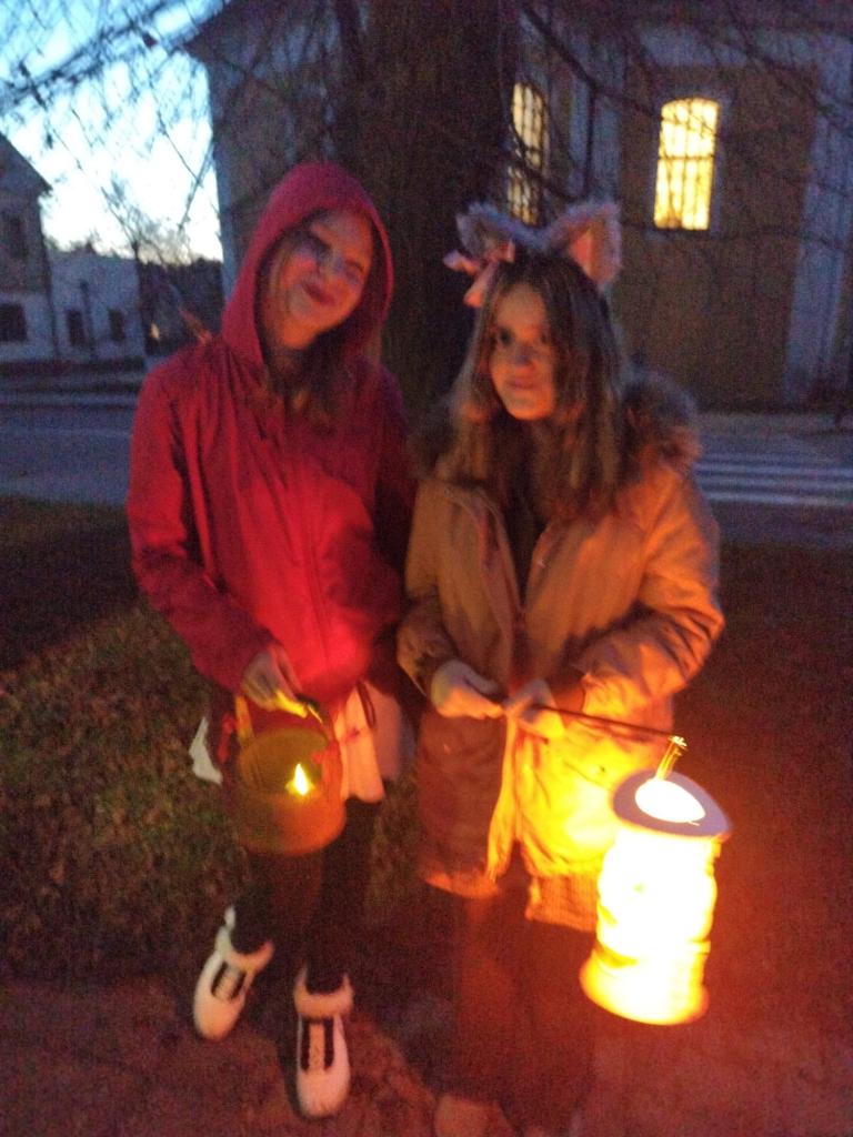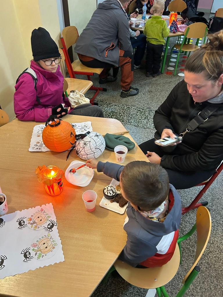 Hned na začátku čekalo na všechny účastníky milé překvapení! Každý obdržel malý dáreček ve formě roztomilých duchů a dýní, které pro nás s velkou pečlivostí vytiskl na 3D tiskárně pan učitel Mráz. Po obdarování se průvod seřadil a vydal na cestu. Obec nám vyšla vstříc a vytvořila kouzelnou atmosféru tím, že pro náš průvod vypnula pouliční osvětlení. V kombinaci s nádherně zářícím úplňkem se lampionový průvod stal nezapomenutelným zážitkem plným mihotavých světýlek a stínů. Trasa vedla podél silnice, okolo benzinové ppumpy, k trojčatům a následně jsme zabočili ke koním. Zpět ke škole jsme se vraceli okolo ateliéru zvonařky a hrnčíře. Na konci cesty, u kostela sv. Máří Magdalény, čekalo na naše nejmenší účastníky sladké překvapení a setkání se strašidly! Závěr akce patřil teplému občerstvení a posezení v budově školy. Díky zlatým rukám našich učitelů a obětavých maminek si všichni mohli pochutnat na skvělých buchtičkách a muffinech. Rádi bychom tímto upřímně poděkovali všem maminkám, které si daly tu práci a upekly dobroty pro celou akci! K dispozici byla také limonáda, teplý čaj, a pro dospělé káva nebo příjemný svařák. Akce byla velmi vydařená a plná radosti a světýlek.