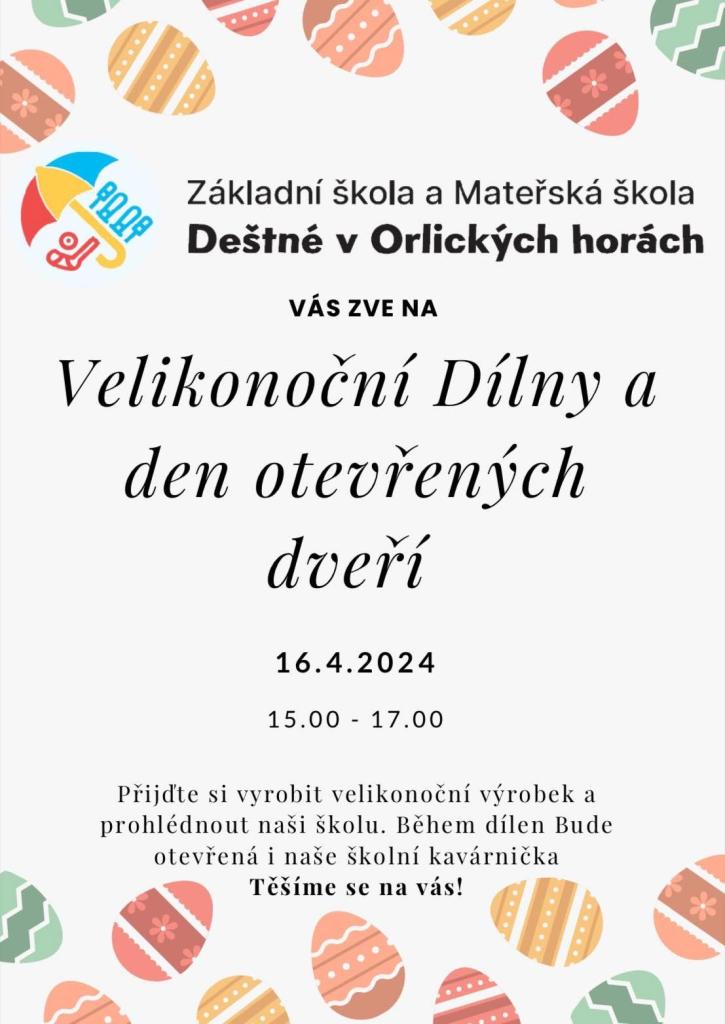 Základní škola a Mateřská škola Deštné v Orlických horách pořádá Velikonoční dílny a den otevřených dveří 16. dubna 2024 od 15:00 do 17:00. Přijďte si vytvořit velikonoční výrobek a prohlédnout si naši školu. Těšíme se na vás!